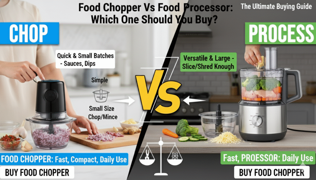 Both Food Chopper Vs Food Processor are essential kitchen appliances. Each serves unique purposes for modern cooking needs. Food manual chopper handles small cutting and
